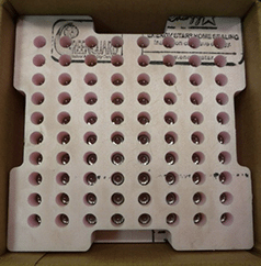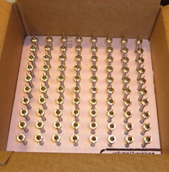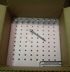 Once more we were on the hunt for suitable packing material that met our customer’s request. Not only did most of their parts have a requirement for aesthetic appearance, but, some of the parts had tips that could not be bent or damaged. We experimented with cardboard and dividers, but as before, found these to be to difficult to find and too costly. We needed something rigid and at the same time a material that would not damage the parts or add too much additional weight. We had some 2” foam insulation left over from a project and an idea was born.